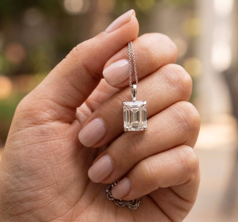 This stunning pendant features a 2.5 carat emerald-cut moissanite stone, known for its clean lines and mirror-like sparkle. Designed for those who love minimalist yet luxurious jewelry, this piece is perfect for everyday wear or special occasions.