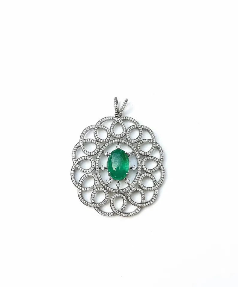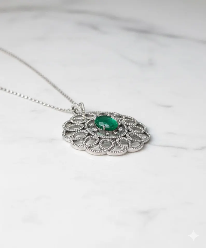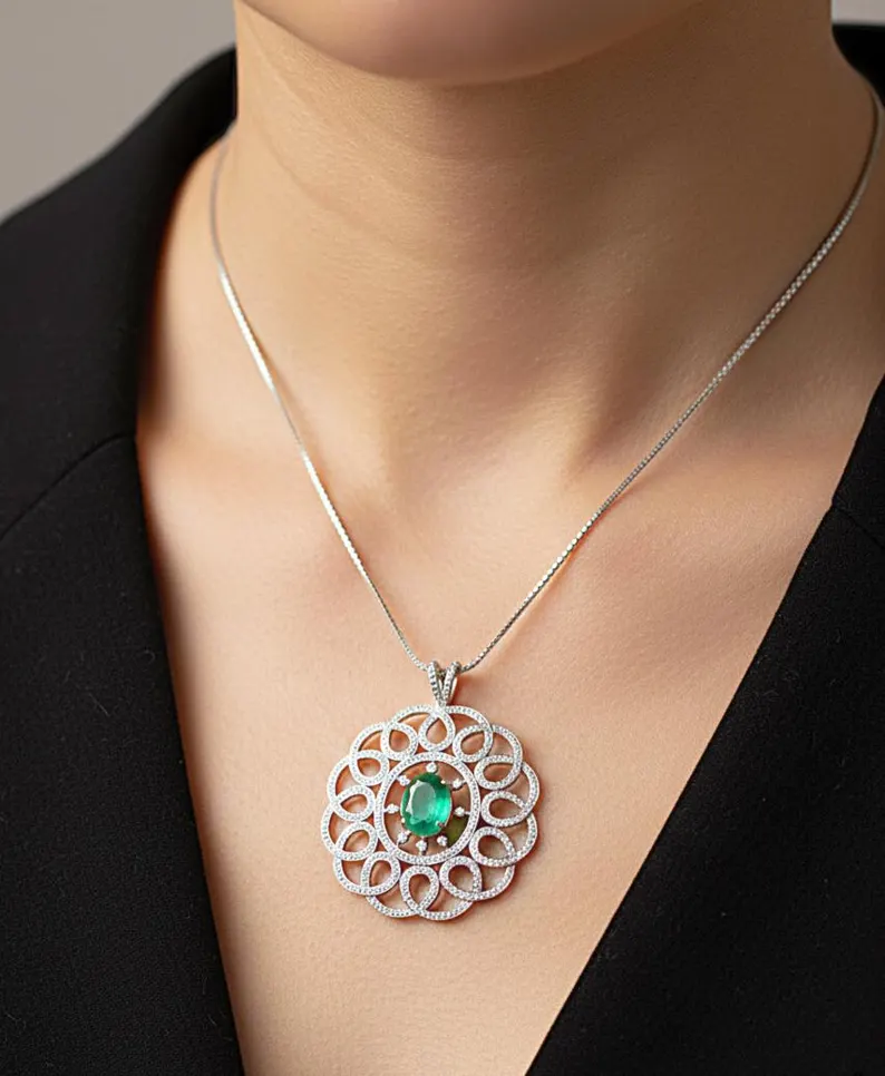 Add royal elegance to your fine jewelry collection with this breathtaking Emerald & Diamond Halo Pendant, designed to capture timeless luxury and sophisticated brilliance. Inspired by vintage floral artistry with a modern statement touch, this pendant radiates charm from every angle.